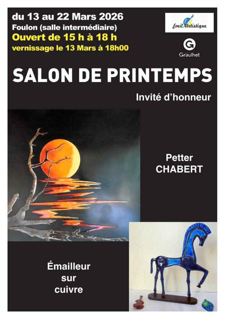 L’Eveil Artistique a le plaisir de vous inviter au vernissage du salon de printemps 2026 le vendredi 13 mars, à 18h,au Foulon (salle intermédiaire).